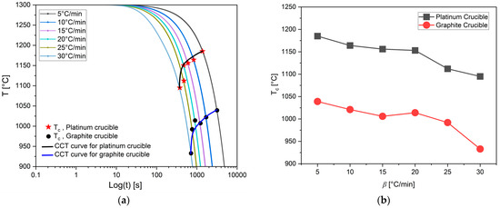 (a) The diagram shows the standard CCT curves of the mold flux constructed from crystallization temperatures at various cooling rates. Red stars and black circles represent the crystallization temperatures, Tc, for all different cooling rates in platinum and graphite crucibles, respectively. The black and blue curves show CCT curves for platinum and graphite crucibles, respectively. The legend indicates the cooling rates. (b) The difference in the onset of primary crystallization temperatures of the mold flux at different cooling rates in platinum and graphite crucibles.
