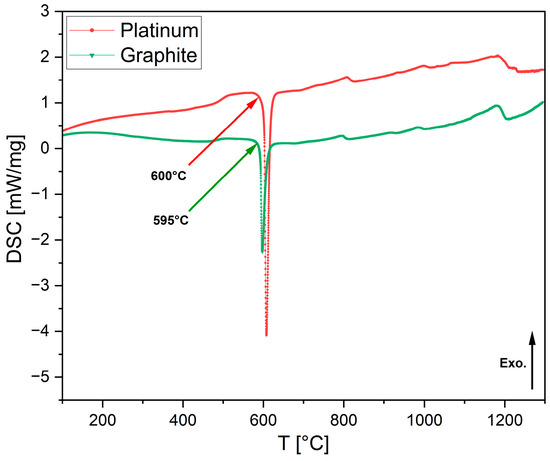 Table 3 summarizes the various onset temperatures for primary crystallization in graphite and platinum crucibles. On average, the onset of primary crystallization occurred at 143 °C lower during cooling when switching from a platinum crucible to a graphite crucible. In the case of the platinum crucible, good wettability between the liquid flux and the crucible appeared to favor the heterogeneous nucleation of the solid. As a result, increased wetting promoted crystallization. Consequently, lower onset crystallization temperatures (higher undercoolings) were observed in the presence of graphite crucibles. Table 4 presents the mass losses during all tests in both crucibles in the DSC. On average, the DSC tests showed a mass loss of approximately 3%, indicating minimal material degradation or volatilization during the experiments. Moreover, the losses were decreased with increased cooling rates for each crucible type.