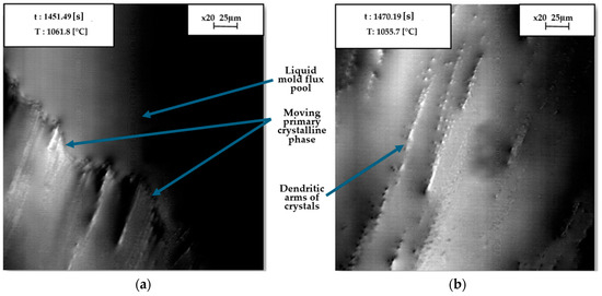The crystallization process of the mold flux specimen in the graphite crucible was observed at a cooling rate of 20 °C/min. The images were focused on the center of the specimen surface, where the bright spot was located: (a) growth of the primary crystalline phase as it moved diagonally across the liquid flux; (b) instantaneous time of progressed undercooling, which led to crystal growth and the development of secondary dendritic arms perpendicular to the surface. t and T denote time and temperature respectively.