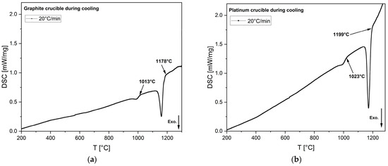 DSC heat flow curves of synthetic slags tested in (a) a graphite crucible and (b) a platinum crucible at a cooling rate of 20 °C/min. Arrows indicate the onset of solidification or phase transformation corresponding to the temperature. In the above pictures, the direction of exothermic heat flow is downward.