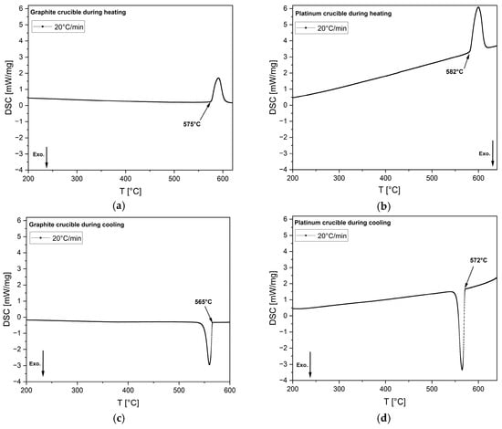 DSC heat flow curves of the standard material Li2SO4 tested under the following conditions: (a) in a graphite crucible at a heating rate of 20 °C/min; (b) in a platinum crucible at a heating rate of 20 °C/min; (c) in a graphite crucible at a cooling rate of 20 °C/min; and (d) in a platinum crucible at a cooling rate of 20 °C/min. Arrows mark the onset of solidification or phase transformation at the corresponding temperatures. In the images above, exothermic heat flow is directed downward.