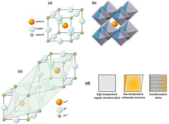 A representative example of the ABX3 perovskite structure (a), along with its characteristic symmetry (b). The structural transformation scheme for LaMO3 (M = Co, Fe) as a function of temperature is illustrated in (c). This transformation often leads to the formation of twin domains within the material, as depicted in (d).