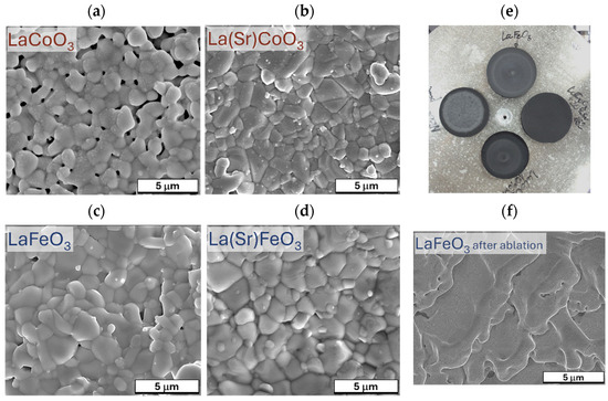 SEM images illustrating the surface topography of the targets used in the study; (a) LaCoO3, (b) La(Sr)CoO3, (c) LaFeO3, (d) La(Sr)FeO3; and (e) macro image of targets ready for microscopic examination and (f) the surface of the LaFeO3 target after laser ablation.