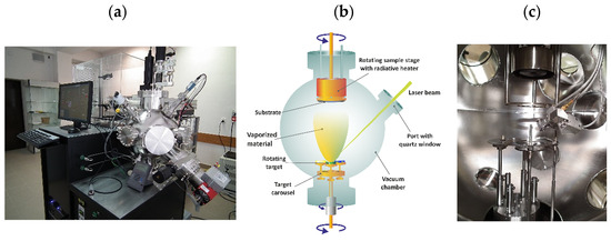 Laser ablation system (PLD) built with an Nd:YAG laser and the Neocera vacuum chamber, connected by an optical system (a). Schematic of the PLD process (b) and a view inside the process chamber (c).