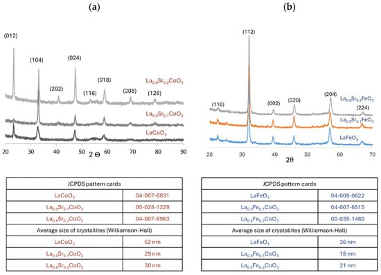 XRD phase analysis of (a) Sr-doped LaCoO3 and (b) Sr-doped LaFeO3 thin films, with JCPDS pattern cards and average crystallite sizes (estimated using the Williamson–Hall method).