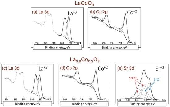XPS spectra of the La 3d, Co 2p, and Sr 3d lines for lanthanum cobaltite thin films are shown in Figure 5. The La 3d spectral line (3d5/2 and 3d3/2) in all samples (Figure 5a,c) consists of two doublets, despite lanthanum being present in only one oxidation state. Both doublets have comparable intensities. The first doublet at a lower binding energy is the main line (BE ≈ 833 eV), while the second at a higher binding energy is the satellite. The presence of these two doublets arises from the complex electron configuration in lanthanum oxides or perovskites (3d9f0L or 3d9f1L−1, where L denotes the oxygen ligand). The position and intensity ratio of the component doublets indicate that lanthanum has the same oxidation state of +3 in all analyzed samples. Similarly, the Co 2p spectrum in all samples (Figure 5b,d) consists of two doublets (Co 2p3/2 and Co 2p1/2)—the main line and the satellite, respectively. The stronger doublet at a lower binding energy (BE ≈ 780 eV) is the direct photoelectron line, while the satellite doublet is formed through a shake-up process. The position and shape of the Co 2p spectral lines are nearly identical in both samples, suggesting that cobalt is in the same chemical state. However, determining the specific oxidation state is challenging because the Co 2p line does not exhibit significant shifts in binding energy with changes in Co oxidation state. Based on the position of the Co 2p lines, the oxidation state of cobalt could be +2, +3, or +4. The Sr 3d strontium spectral line, observed only in Figure 5e, consists of two doublets (3d5/2 and 3d3/2). The doublet with lower binding energy (BE ≈ 132 eV) is attributed to SrO, while the doublet with higher binding energy (BE ≈ 134 eV) corresponds to SrCO3. In both compounds, strontium has an oxidation state of Sr2+. The presence of strontium carbonate is likely due to the reaction of SrO with incidental carbon, a common surface impurity [37].