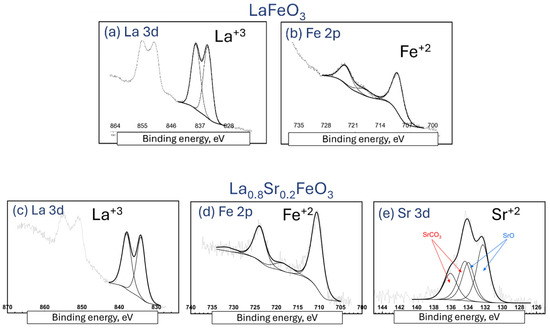 The La 3d5/2 spectra for all analyzed lanthanum ferrite La(Sr)FeO3 films do not change on the cross-section (Figure 6). The spectrum has a main peak at BE ≈ 833 eV and a satellite. The energy values at which the peaks occur are typical for rare earth oxides [38]. The Fe 2p and Sr 3d spectra were analyzed. The Fe 2p3/2 and Fe 2p1/2 spectra for the respective thin films are shown in Figure 6b,d,e. The Fe 2p3/2 spectrum exhibits a main peak at a binding energy (BE) of 706.3 eV and a satellite peak separated by ~4 eV. The Fe 2p1/2 peak (BE ≈ 720 eV) also shows a satellite. The obtained binding energies are lower than those typical for Fe-O oxides, where the Fe 2p3/2 peak for Fe3+ is located in the range of 710 ÷ 711 eV [39]. Such low binding energy of Fe 2p3/2 has been observed in LaFeO3 perovskites prepared by the sol-gel method. The presence of the satellite peak near the Fe 2p1/2 peak indicates the presence of Fe4+ [39]. The Sr 3d spectra (Figure 6e) consist of two peaks: Sr 3d5/2 (BE ≈ 133 eV) and Sr 3d3/2. The position of the Sr 3d5/2 peak indicates the presence of Sr2+, e.g., in SrO.