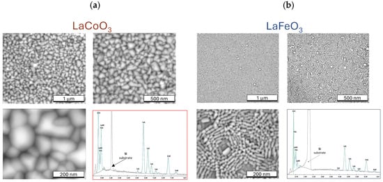 SEM images of the topography of perovskite thin films grown on monocrystalline Si substrates [001] with the result of EDS analysis of the chemical composition for (a) LaCoO3 and (b) LaFeO3.