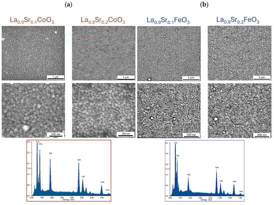 Scanning electron microscopy (SEM) analysis of La(Sr)CoO3 and La(Sr)FeO3 thin films (Figure 7 and Figure 8) reveals that both stoichiometric perovskite and Sr-doped films exhibit compact structures free of surface defects such as pores or cracks. While occasional particle clusters (aggregates larger than surface irregularities) are observed on the film surfaces, they are typically comparable in size to existing (and equally sporadic) droplets. During the ablation process, particularly at high energy densities or reduced target–substrate distances, larger quantities of target material may be dislodged and transferred to the substrate within the plasma plume. However, the presence of these clusters, if limited, does not significantly impact the film quality or properties, as their chemical composition is nearly identical to the compact, crystalline structure (Table 2 and Table 3). Energy-dispersive X-ray spectroscopy (EDS) analyses confirm that all thin films maintain the desired stoichiometry without over-enrichment of La, Fe, Co, Sr, or O. Although the observed clusters are not detrimental, larger droplet formation can be mitigated through the use of large, polished targets and optimization of the target–substrate distance for the specific deposition atmosphere. Operating at excessively low energy densities necessitates more pulses to achieve the desired coating thickness and can lead to the formation of high cones on the target, which is undesirable. Conversely, excessively high energy densities should be avoided to prevent the generation of sizable aggregates and increased droplet formation on the film surface. Therefore, optimizing process parameters, including photon energy, oxygen partial pressure, target–substrate distance, and substrate temperature, is crucial for minimizing droplet formation and achieving high-quality films. While complete elimination of droplet formation is impossible due to the inherent nature of the pulsed laser deposition (PLD) process, careful parameter control can effectively limit their size and frequency. A key observation in Sr-doped LaCoO3 and LaFeO3 thin films is the significant refinement of the surface structure (topographical indication). This clearly suggests that Sr doping, in addition to altering the ionic (internal) structure, promotes the formation of smaller crystallites during film growth. SEM observations support the crystallite size analysis performed using XRD (Williamson–Hall analysis results illustrated in Figure 4) and further suggest that these changes in topography should also be observable via atomic force microscopy (AFM).