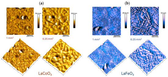 Atomic force microscopy (AFM) analysis of the LaCoO3 and LaFeO3 thin films (Figure 9), conducted using tapping mode in air, confirms the observations made at a larger scale via scanning electron microscopy (SEM) (Figure 7). The AFM images reveal that the film surfaces are composed of fine irregularities, or bulges, which form the thin film itself. Droplets, limited to diameters of less than 1 µm, are observed only in certain areas. Notably, the surface morphologies of the two perovskite films exhibit distinct characteristics. The LaCoO3 film displays a uniform and regular surface topography with consistent shapes among the topographic elements. In contrast, the LaFeO3 film shows diverse nanoclusters, and its surface can be broadly divided into two regions: one characterized by grains with sharp tips, and the other by grains with flat ends. These nanometer-sized grains, characterized by sharp edges (needle-like morphology), typically exhibit elongation in multiple directions and encircle flatter regions on the thin film surfaces.
