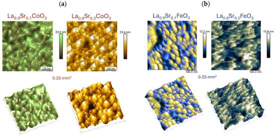 The AFM images shown in Figure 10 for Sr-doped LaCoO3 and LaFeO3 thin films confirm previous observations (SEM topography observations, Figure 7), clearly showing significant surface structure fragmentation as Sr doping progresses. Moreover, LaFeO3-based perovskites (Figure 10b) exhibit a distinctly homogenized surface topography. Surface features become more regular and rounded compared to the irregular (dual) surface morphology characteristic of stoichiometric LaFeO3 perovskite (Figure 9b). These observations are quantitatively supported by the roughness parameters measured for all (pure and Sr-doped) LaCoO3 and LaFeO3 perovskites, which are compiled and presented in Table 4.