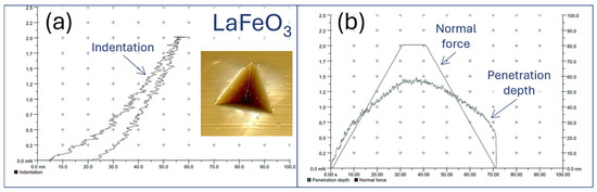 Nanomechanical properties of thin films were measured according to standardized guidelines for thin film characterization, with particular attention paid to the penetration depth and film thickness. Measurements were performed using a Vickers indenter with a Berkovich diamond tip under a load of 2.5 mN. Example measurement curves for LaFeO3 are presented in Figure 11 along with an AFM image of the resulting nanoindentation. It is important to note that, even when standardized guidelines are strictly followed, the measurement result obtained for such thin films should be considered as representative of the specific system comprising the substrate and the thin film deposited on it.