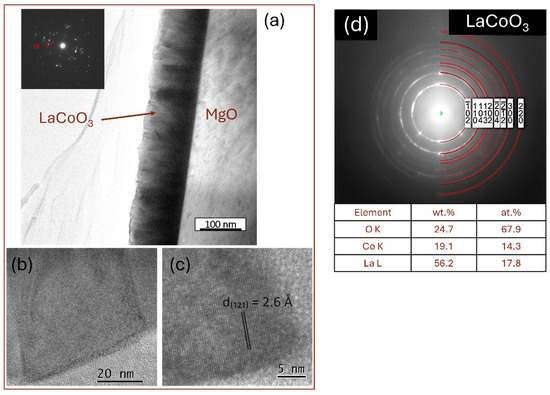 TEM analysis of LaCoO3 thin films: (a) low-magnification bright-field image with selected area electron diffraction pattern, (b,c) high-resolution TEM images, and (d) SAED solved with TEM/EDS analysis.