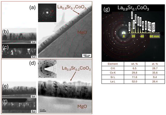 TEM analysis of Sr-doped LaCoO3 thin films: (a,b,d,e) low-magnification bright- and (c,f) dark-field image with selected area electron diffraction patterns, and (g) SAED solved with TEM/EDS analysis.