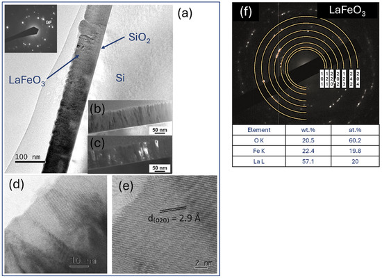 TEM analysis of LaFeO3 thin films: (a,b) low-magnification bright- and (c) dark-field image with selected area electron diffraction pattern, (d,e) high-resolution TEM images, and (f) SAED solved with TEM/EDS analysis.
