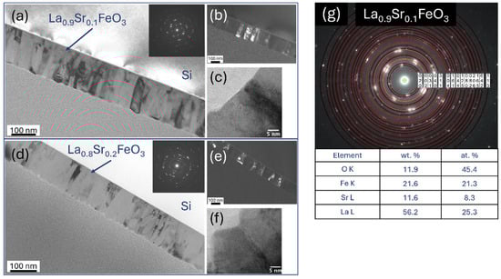 TEM analysis of Sr-doped LaFeO3 thin films: (a,d) low-magnification bright- and (b,e) dark-field image with selected area electron diffraction patterns, (c,f) high-resolution TEM images and (g) SAED pattern solved with TEM/EDS analysis.