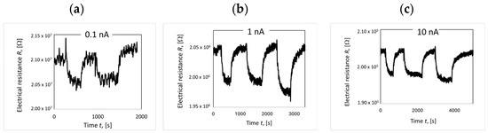 Thin films of deposited LaCoO3, LaFeO3 and their Sr-doped variants were tested in the presence of 50 ppm NO2 at temperatures ranging from 200 to 500 °C. The samples were placed in a cell and heated to 300 °C under continuous airflow for at least 3 h prior to the initial measurements. The purpose of this treatment was to remove contaminants from the sample surface and the cell. To stabilize the measurement signal after reaching the target temperature, the sample was held under voltage with airflow until a stable baseline signal (Rair) was obtained. To determine the effect of current on sensitivity, the response under NO2 at 500 °C was measured at different currents: 0.1 nA, 1 nA, and 10 nA (Figure 16). It was observed that sensitivity did not change with varying current (a constant value of 4% was obtained for all the initial measurements taken). The effect of the current was observed only on the noise-to-signal ratio. Noise decreased with increasing current. Further measurements were carried out using 1 nA.