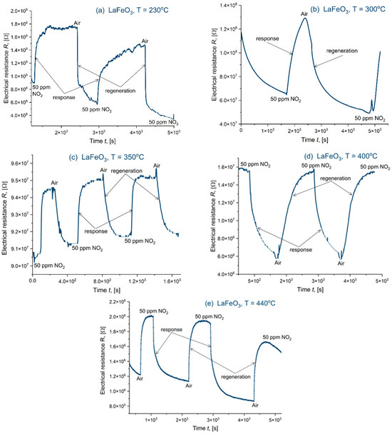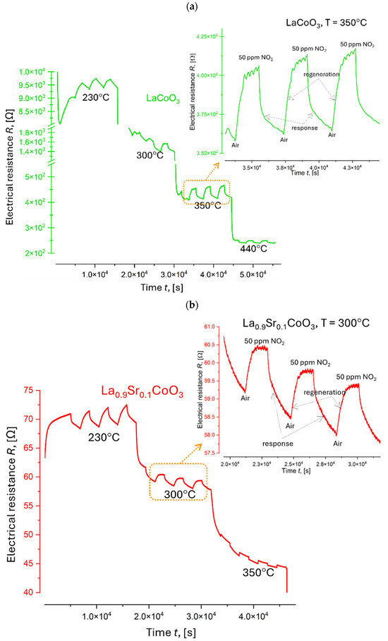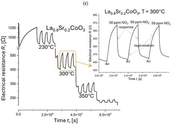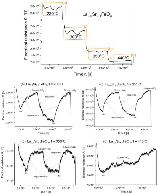The electrical resistance response (R) of three La(Sr)CoO3 thin films to 50 ppm NO2 was investigated at various operating temperatures (230 °C, 300 °C, 350 °C, and 440 °C). The results are presented in Figure 17. Prior to gas exposure, the sensor response was stabilized for several hours at a constant temperature of 230 °C. Subsequently, the gas environment was cycled between pure air and 50 ppm NO2 while maintaining a constant total gas flow of 200 cm3 min−1 and a relative humidity of 50% ± 2%. Figure 17 illustrates the decrease in resistance with increasing temperature, a characteristic behavior of extrinsic semiconductors. This can be attributed to the increased number of thermally generated electrons at higher temperatures, leading to enhanced conductivity and a corresponding decrease in resistivity. Furthermore, the introduction of the oxidizing gas (NO2) resulted in a decrease in resistance at each measured temperature. This observation is likely due to the adsorption of NO2 onto the surface of the p-type LaCoO3-based semiconductor, coupled with the oxidizing nature of NO2.