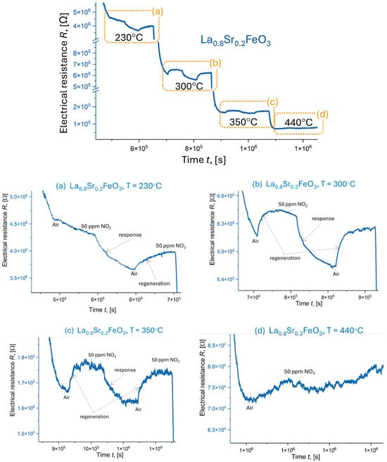 Response of La0.8Sr0.2FeO3 exposed to 50 ppm NO2 (summary chart) and for a range of temperatures: (a) 230 °C, (b) 300 °C, (c) 350 °C, and (d) 440 °C.