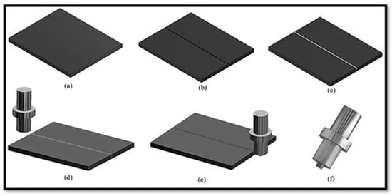 Schematic diagrams for composite fabrication via FSP. (a) The plate of known dimension (b) Groove making on the surface of the plate (c) Filling of particles in the groove (d) Closing of the groove with a pin-less tool (e) Processing of the plate (f) The tool with a pin used for processing.