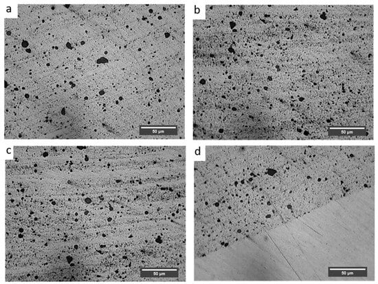 Ceramic particles can be incorporated in the metal matrix through various solid- and liquid-based processes such as powder metallurgy [], mechanical alloying [], in situ reactions [], spark plasma sintering [], spray forming [], etc. It is very difficult to control defects like porosity [], non-uniform distribution [], and clustering [] and interfacial reactions during these processes. Nonetheless, FSP does not include such defects if properly handled [,,] because of its solid-state nature.