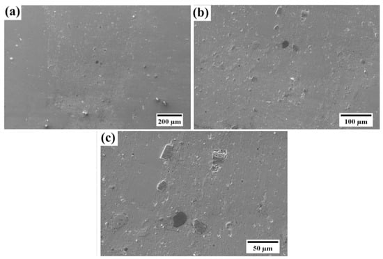 It is evident from the microstructure, the SiC particles are distributed throughout the copper metal matrix. The image was captured at the various sections of the processed plate to justify the fact that particles are everywhere. Moreover, the particles are almost placed equidistant from each other, i.e., the particle free space is not visible in the micrograph. In processes where solidification involves, the scenario is generally reversed, i.e., particle segregation along the grain boundaries is hard to control []. Segregation of particles in phenomena like stir casting is because of the difference in densities of the reinforcements and the matrix. In the present study, nothing like that was observed, which is solely because the process is having solid nature where solidification did not occur. The process (FSP) involves severe plastic deformation of the matrix without melting. As the matrix is not in the molten phase, reinforcements are not free to move freely either at the top or the bottom due to density difference. Hence, the developed composite is free from the segregation of Si particles. Additionally, the particles are dispersed homogeneously in the copper matrix. Also, the complete stir zone is engulfed in the particles. Agglomeration of particles or particle free space is not visible in the microstructure. The processing parameters such as blade speed, tool rotational speed, tilt angle, axial load, etc. play a vital role in the dispersion of particles in the matrix []. So, it can be safely assumed that the chosen parameters for the present experimentation were appropriate. Homogeneous sputtering of particles in the matrix is essential for better performance of the composite including isotropic properties. Microstructural features of the composites were also captured through the SEM (Figure 6).