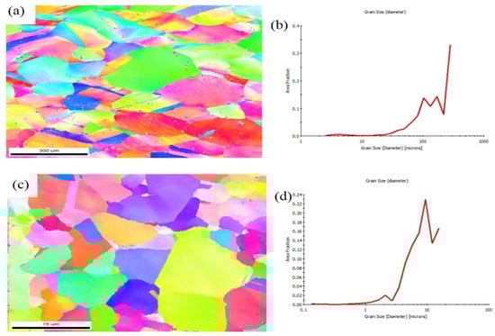 EBSD images of (a) base copper and (c) composite and grain size distribution (b,d).