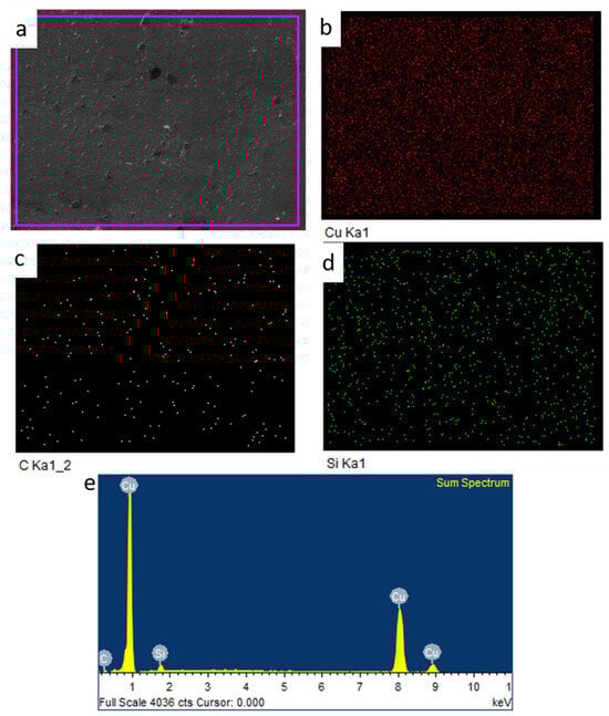 Copper–silicon carbide has been the centre of attraction globally because it possesses high thermal and electrical conductivities along with good mechanical and wear properties [,,,]. Therefore, they are not only a strong candidate as a component in thermal packaging but also as an electrical contact in relays, switches, circuit breakers, railway overhead current collectors, etc. [,,]. Copper reinforced with particles (TiC, Al2O2, SiC, B4C, etc.) [,] are termed as copper matrix composites. Among various ceramic particles, SiC particles are considered fascinating due to its properties like high wear resistance, elastic modulus and excellent oxidation and corrosion resistance along with good mechanical properties []. Also, it is appropriate cost-wise for consideration as reinforcement.