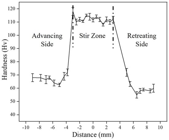 The average hardness value for the base copper was estimated to be 66 HV, whereas the fabricated composite was found to have exhibited higher hardness (114 HV). The hardness value has decreased slightly in the heat-affected zone. Annealing effect may be responsible for this decrement. In the heat-affected zone, dislocation density decreases, which might have further reduced hardness. As discussed earlier, FSP leads to grain refinement due dynamic recrystallisation. Because of small grains in the material, the number of grain boundaries will increase, which act as an obstacle for the free movement of dislocations. As dislocations are not free to move thus hardness increased. Other strengthening mechanisms like Orowan strengthening, the shear lag mechanism, and difference in the thermal coefficient mechanism [,] play an important role in the hardness improvement of the composite. The small, fractured particles of reinforcement brought about the pinning effect in the scene and stopped or delayed the movement of dislocation, which increased hardness. The interfacial integrity displayed an important role in transferring the load from soft copper to hard SiC, which bore the load more effectively and thus hardness increased. The additional dislocations developed owing to the difference in thermal coefficients either deflated or created a hindrance to dislocations, which also caused an improvement in hardness. A similar trend of hardness was observed by H. Kumar et al. [].