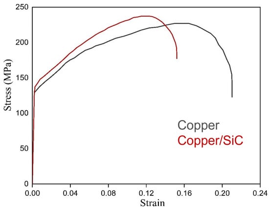 The effect of particle incorporation (SiC) in the copper matrix was further checked through tensile testing. The stress–strain curve for the composite and base copper is depicted Figure 10.
