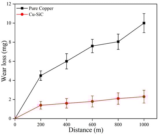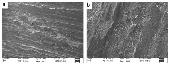 It may be observed that with an increase in distance, the wear loss is increasing in both base copper and the composite. This gradual increase in wear loss with distance may be attributed to the melting of wear specimens. As samples slid on the counter, surface temperature will rise with respect to the increase in slid distance and hence the melting of the specimens. The wear loss of the composite has substantially reduced in comparison to base copper. This reduction in wear loss in the composite with respect to base copper may be attributed to the presence of hard SiC particles in the composite: their increased hardness. According to Archard’s law, hardness is directly proportional to wear resistance. Other mechanisms like grain refinement and work hardening may also be considered as a reason for higher wear resistance in the case of the composite. The hard SiC particles dispersed uniformly in the copper matrix may also be considered as one of the reasons behind the wear resistance improvement. These uniformly distributed particles will carry the load applied and also prevent the cutting of pins from the counter materials []. The worn surface morphology of base copper and the composite at speed 1.5 m/s and with a load of 30 N is depicted in Figure 13.