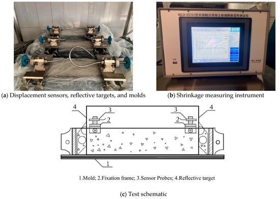 As shown in Figure 1, a non-contact method was used for testing, and the data were recorded using a shrinkage expansion deformation tester with a high-performance embedded data acquisition system (model NELD-ES731), which was developed by Beijing NELD intelligent Technology Co., Ltd. (Beijing, China), the test data was recorded once every hour. The test environment was maintained at a temperature of (20 ± 2) °C and relative humidity of (60 ± 5)%. A digital temperature sensor was used to monitor the surrounding temperature and humidity. The target is locked firmly and kept vertical before the start of the test. No violent vibrations occurred during the test period, and it was strictly prohibited to touch the sensor, reflective target, or mold [26].