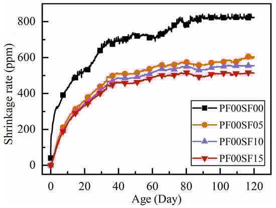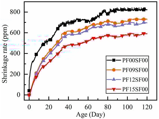 Flexible PF, with its low modulus of elasticity, can effectively bond with mortar inside the matrix after being incorporated into RAC. This bonding improves the poor pore structure of RAC, reducing the number of capillary pores and internal porosity, ultimately lowering the total shrinkage rate [10,28]. The effects are as follows: the shrinkage change curve of PF-reinforced RAC stabilizes faster than that of ordinary RAC. The rate of shrinkage increases and the maximum shrinkage at the same age decreases with higher polypropylene fiber content. The improvement in shrinkage performance is particularly noticeable when the polypropylene fiber content reaches 1.5 kg/m3.