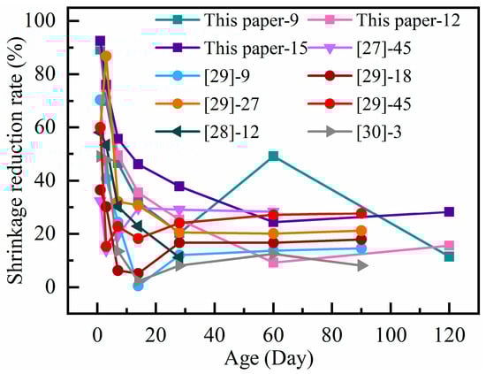 The change rule of shrinkage reduction rate with age under different steel fiber dosages are shown in Figure 5. The experimental results in this paper are compared with those in the previous literature [13,18,29,31,32]. It can be seen that adding steel fibers significantly reduces shrinkage. The trend observed in the results of other studies is similar to the findings in this paper. Chen et al. [13] discovered that steel fibers played a crucial role in reducing concrete shrinkage, with the reduction stabilizing after 28 days, ranging from 17% to 35%.