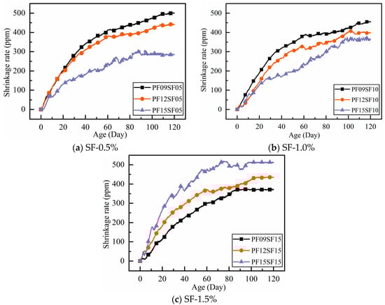 In Figure 6c, the trend of shrinkage variation is significantly different from that of the hybrid group (SF-0.5%, 1.0%). The shrinkage variation in each group was significantly different before 10 days, and the difference gradually increased after 10 days. After 60 days, the shrinkage no longer changed significantly. It is worth noting that as the polypropylene fiber content increased, the overall shrinkage curve shifted upward, and the shrinkage value at each age increased. This trend was the opposite of the change pattern observed in the hybrid group (SF-0.5%, 1.0%).