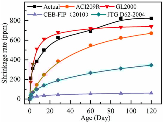 Numerous studies on concrete shrinkage calculation models are currently being conducted both domestically and internationally. Since there are many variables that can affect shrinkage, various models use different sets of parameters. The theoretical shrinkage values at different ages were calculated using the equations from ACI PRC-209.2-08 [33], CEB-FIP (2010) [34], GL2000 [35], and JTG 3362-2018 [36]. The calculated shrinkage values were then compared with the test shrinkage values of ordinary RAC, as shown in Figure 7. To compare the differences between calculated and experimental values more intuitively, a difference coefficient λ was introduced. This coefficient compares the differences between the mean values of calculated and measured ratios for each group within 120 days of age. The equation for the difference coefficient λ is shown in Equation (5):