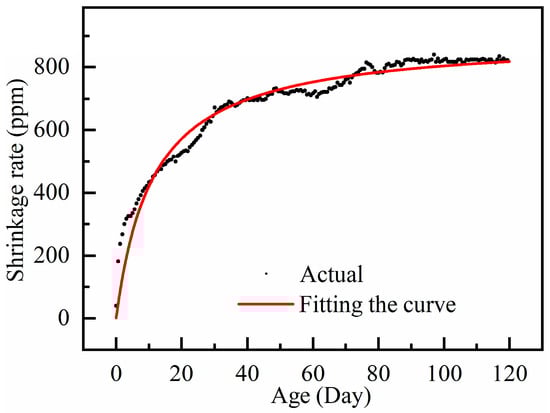 The measured data of RAC shrinkage were brought into the GL2000 model and Equation (6) was fitted to the actual shrinkage rate for analysis, as shown in Figure 8. The corrected coefficients, a and b, were obtained as 0.852 and 2.807, respectively, and the fitted correlation coefficient R2 was 0.979, indicating a strong correlation. The fitted prediction model is shown in Equation (7):