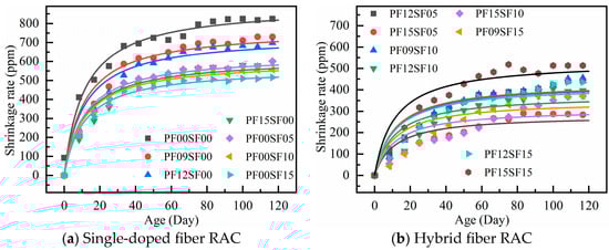 The shrinkage of the hybrid group (SF-0.5%, 1.0%) gradually decreases with the increase in polypropylene fiber content, and the trend is exactly the opposite when the SF content is 1.5%. This may be due to the higher total volume fraction of fibers, which leads to the formation of voids between the cement paste and fibers, thus increasing the porosity of the concrete and accelerating water escape. The higher fiber volume reduces the concrete’s density, weakening the fiber bonding effect. For RAC materials with lower density and higher porosity, only the appropriate fiber content can more effectively improve shrinkage performance.