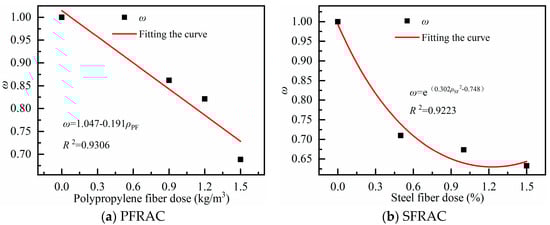 The shrinkage of RAC with different hybrid fibers of polypropylene and steel fibers were fitted with the fiber influence coefficients listed in Table 9. As shown in Figure 10, the equations for the fiber content and influence coefficients of the two fibers are obtained, as presented in Equations (9) and (10), respectively.
