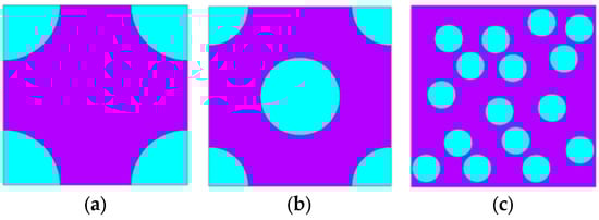 RVEs of MRE composites with (a) square, (b) hexagonal, and (c) random distributions of particles. The purple color represents the matrix, while the blue color represents the particles.