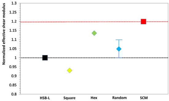 In addition to the FEM simulations, we include results from two widely used analytical methods: the Hashin–Shtrikman lower bound (HSB-L) [31], which provides a lower-bound estimate, and the Self-Consistent Method (SCM) [32,33], which offers an upper-bound prediction. These analytical bounds are represented by the dashed lines in Figure 2, indicating the range within which the effective modulus is expected to fall. The effective shear moduli are divided by the corresponding HSB-L values to obtain dimensionless ratios for comparison. For the random microstructure, the plotted range represents the variation in shear stiffness across a hundred different particle arrangements. The central marker indicates the average value, while the upper and lower limits represent the maximum and minimum values observed.