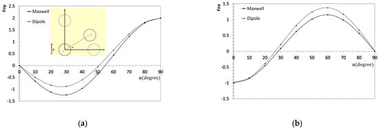 Although the dipole method provides reasonable accuracy for l = 3r, our analysis thus far has only considered perfectly aligned particles, as seen in the square distribution. To address this limitation, we conducted additional simulations to account for particles with varying angular orientations. In this case, the distance between particle centers is fixed at l = 3r, and one particle is rotated around the other. The magnetic force components, and , were calculated at 10° intervals from 0° to 90°, as shown in Figure 4.