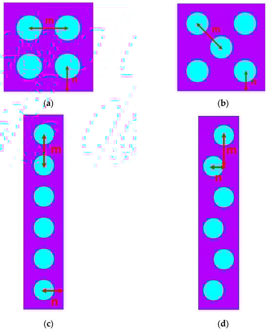 To further investigate this angular dependence, we propose four RVEs with different particle distributions: (a) square, (b) hexagonal, (c) straight chain, and (d) wavy chain, as illustrated in Figure 5. Maintaining a minimum inter-particle distance of 3r while controlling the volume fraction is challenging for the random microstructure. Additionally, the results for random microstructures exhibit significant variability, making them unsuitable for meaningful comparisons. Therefore, random microstructures were not included in this section. All configurations maintain the same volume fraction of 25.6%. The geometry of each RVE is adjusted to ensure a minimum inter-particle distance of l = 3r, with detailed particle distances provided in Table 1 using parameters m and n. Considering a linear elastic small deformation scenario, an elastic modulus of 200 GPa and a Poisson’s ratio of 0.2 is assigned to the particles. At the same time, the matrix is modeled with an elastic modulus of 0.2 MPa and a Poisson’s ratio of 0.49, reflecting its near-incompressibility. The relative permeability of chosen to be 4000 for the particle and 1 for the matrix.