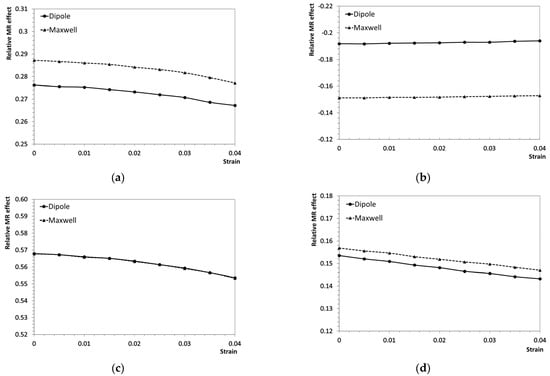 According to the results, the straight chain structure exhibits the highest MR effect, surpassing that of the square distribution. Meanwhile, the wavy chain configuration shows a lower positive MR effect than the square distribution but remains higher than the hexagonal distribution, where a negative MR effect is observed. This aligns with previous experimental findings, which indicate that anisotropic MREs tend to be more sensitive to applied magnetic fields and exhibit a larger MR effect compared to isotropic MREs [36,37]. Despite some differences in magnitude, both the dipole and Maxwell methods exhibit a similar trend in the MR effect with increasing strain amplitude. In Figure 6a,c,d, the positive MR effect decreases with shear strain, while in Figure 6b, the absolute negative MR effect increases with shear strain. This behavior can be attributed to the fact that the MR effect is primarily governed by the increment of the x-component of the magnetic interaction force that develops during deformation. Both particle distance and angular orientation influence this force. As strain increases, the inter-particle distance and angle change based on the specific particle arrangement, affecting the MR effect differently for each microstructure. This finding is consistent with previous experimental observations [8], where the MR effect was shown to vary nonlinearly with shear strain.