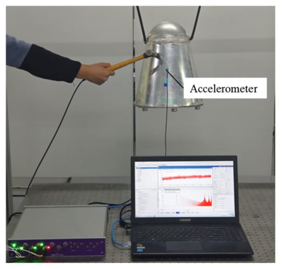 To conduct free modal testing on the aircraft instrument compartment model, it was suspended as shown in Figure 2. The modal experiment employed the impact hammer method for pulse excitation to obtain the structure’s free modes. Considering the structural characteristics, 193 equidistant measurement points were arranged on the second-order curved plate and the conical shell body. One accelerometer is arranged on the structure surface. Since the mass of the accelerometers is much smaller compared to the model mass, their influence on the test can be neglected. Each measurement point was measured four times to ensure data reliability. The Hunter Box (Hanhang (Beijing) Technology Co., Limited, Beijing, China) data acquisition system recorded the experimental data and performed modal analysis. The modal shapes and frequency data obtained will be presented in the following sections for comparative purposes.
