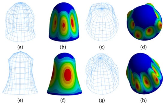 (a) 1st order test mode shape; (b) 1st order simulated mode shape; (c) 2nd order test mode shape; (d) 2nd order simulated mode shape; (e) 3rd order test mode shape; (f) 3rd order simulated mode shape; (g) 4th order test mode shape; (h) 4th order test mode shape.