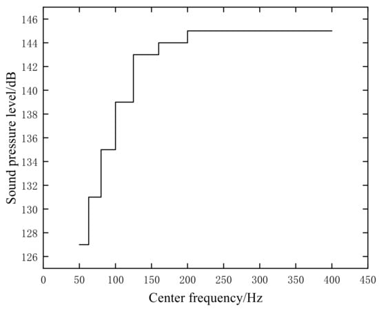 To compare the differences in computational results between the virtual material method and the tied constraint method, models of the instrument compartment are created using both approaches. The vibration and noise responses are then analyzed based on these models. The mesh models are imported into acoustic and vibration analysis software, and the frequency band from 50 to 400 Hz, as shown in Figure 5 according to environmental test standard spectra, is selected as the noise excitation spectrum for both computation and experimentation. The calculated values of the structural acoustic and vibration responses are obtained through this process.