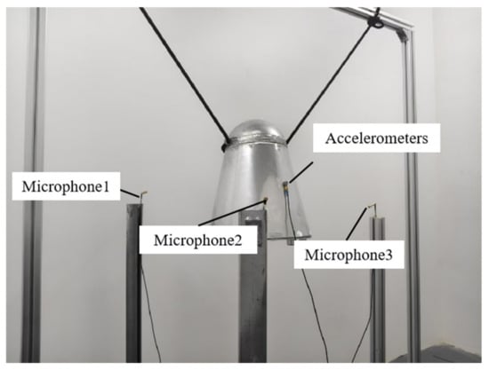 The experiment in this article is based on the acoustic control module of the HANHANG testing system and conducted in a simple reverberation room at Xi’an Jiaotong University. The volume of the reverberation room is 70 m3, and the walls are made of high-density concrete, which can effectively reflect sound waves. The experiment measured the structural vibration response and the internal noise response under a specified noise spectrum excitation, with a noise exposure duration of 30 s. The model was suspended within the reverberation chamber using rubber cords. Three microphones were arranged around the model to employ a three-point averaging method for closed-loop control of the acoustic field. The test site is illustrated in Figure 6.