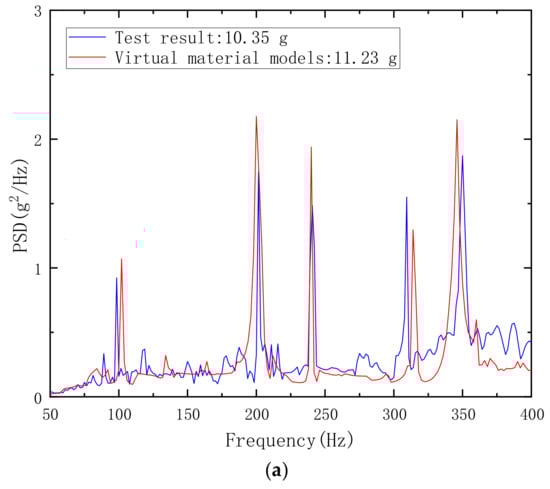 Figure 7 shows the comparison of the calculated acceleration power spectral density curves of the two models with the experimental measured acceleration power spectral density curves, and gives the root mean square value of acceleration. As seen in Figure 7, the acceleration power spectral density curve calculated based on the virtual material model is closer to the experimental values, and the frequency position of the vibration peak is very close. Table 4 shows the frequency of the peak in the experimental and simulated response curves, as well as the frequency offset and error percentage of the simulated values relative to the experimental values. The frequency offset of the virtual material model is much lower than that of the binding constraint model, not exceeding 7 Hz, while the frequency offset of the third peak point of the binding constraint model exceeds 20 Hz. This is caused by the natural frequency of the computational model. The binding constraint law rigidly connects the joint surface, increasing the structural stiffness and natural frequency accordingly. In addition, the vibration peak of the virtual material model is also closer to the actual value. The root mean square value of acceleration obtained from the experiment is 10.35 g, and the root mean square values of acceleration calculated by the virtual material model and the binding constraint model are 11.23 g and 11.71 g, respectively. Obviously, the accuracy of the virtual material model is higher.