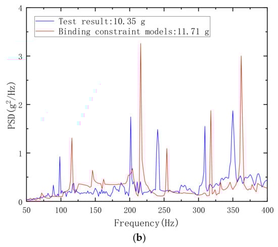 (a) Comparison of Calculated and Experimental Values of Acceleration PSD (Virtual Material Method); (b) Comparison of Calculated and Experimental Values of Acceleration PSD (Binding Constraint Method).